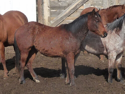 This pretty bay filly is by our own son of Dualin Gun (NCHA points, son of World Champion cutting horse Dual Pep). His dam is our best broodmare, Tee Bar Jeep, a mare that throws stout, well build horses which perform great at the ranch and in the arena.