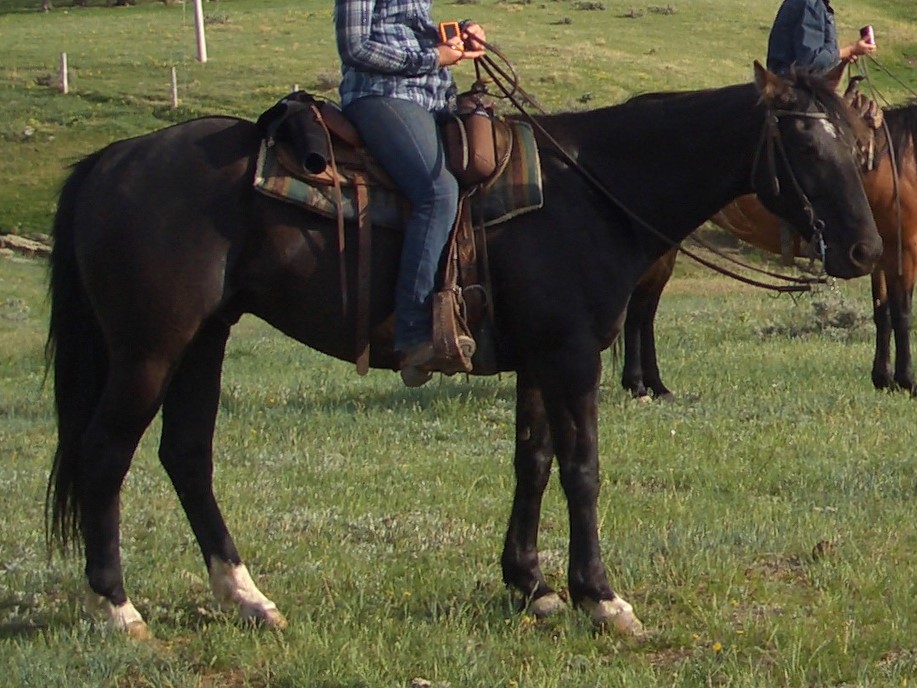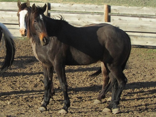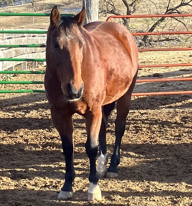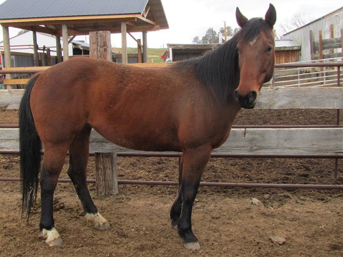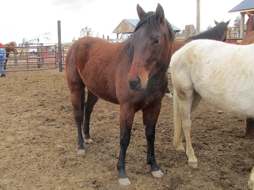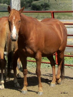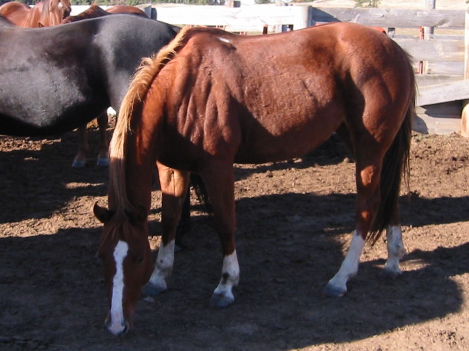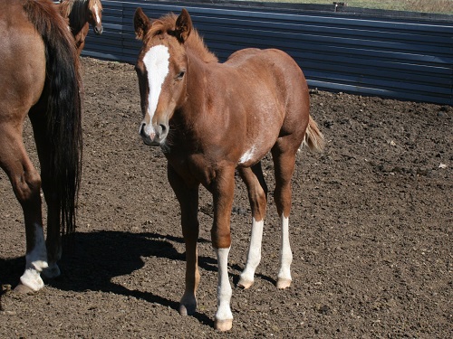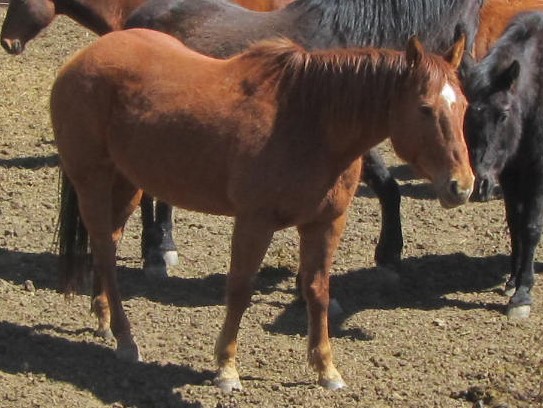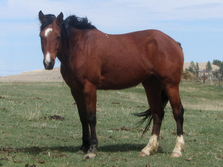 brown, hind pasterns white, upside down mushroom brand right shoulder |